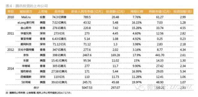 腾讯首次出手上市公司,是2010年出资3亿美元投资于伦敦上市的俄罗斯社交网站Mail.ru,但这实际上是对该公司上市前的一项Pre-IPO投资。腾讯之所以能够入股俄罗斯最大的社交网站Mail.ru,主要是因为腾讯的大股东南非Naspers已先行入股,腾讯算是跟投。
