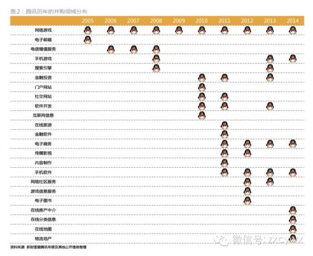 2011年腾讯第一波大规模入股上市公司,一年内接连入股了艺龙(LONG. NSDQ)、金山软件(03888.HK)、华谊兄弟(300027)、寰亚传媒(08075.HK)、顺网科技(300113)5家上市公司;2012-2013年,腾讯的脚步稍稍停顿,仅仅入股了文化中国传播(01060.HK)一家上市公司;2014年,或许是在阿里的贴身肉搏式并购攻势下,腾讯对上市公司的并购迅猛提速,在半年之内先后入股(或追加投资)了京东、乐居、华南城、猎豹移动、四维图新、58同城6家上市公司。