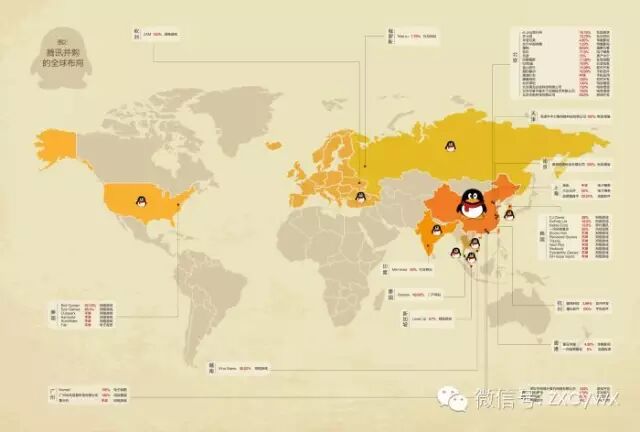 在国内诸多企业走出去举步维艰、屡战屡败时,腾讯的海外并购却已然横跨亚欧美三大洲十个国家与地区,初步奠定了全球化的基础。通过投资参股的形式,腾讯不断培育着产业链的上下游,以打造一个以QQ及微信为核心基础平台、全面开放的互联网生态圈。