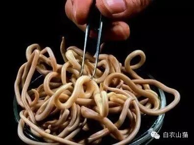 肠子里掏出来的蛔虫一开始会蠕动,马上死翘翘,堆成一盘就是这个样子。对,很像新疆拌面。