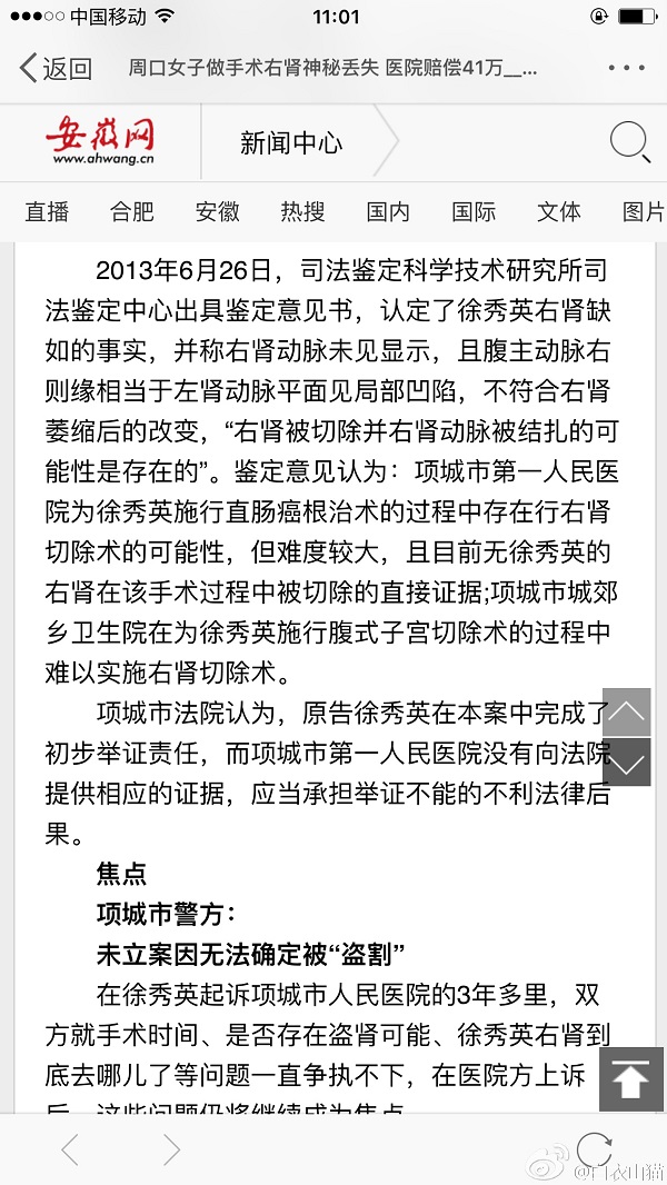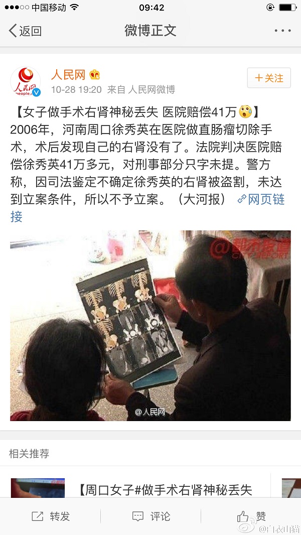 然后,网上又是一片骂声,说医院偷了病人的右肾。反正说什么话的人都有。