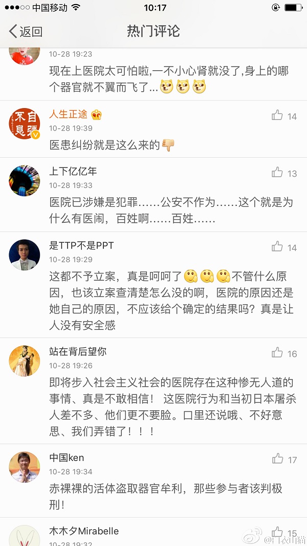 说实在的,链接中,安徽网的报道对于医患双方的说法都有列出,还算客观。然而,@人民网的微博抓取了一部分事实发在微博上,又激起了网民的怒火和对医院的指责,医患关系再一次被撕裂得血淋淋。