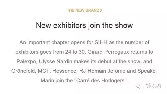 2017SIHH的参展品牌,将从去年的24个增加到30个。其中芝柏Girard-Perregaux又将回到SIHH的展馆Palexpo(芝柏以前在SIHH,前几年转到Baselworld,现在又回归)。雅典UlyseeNardin将第一次在SIHH亮相。还有Grönefeld(很多人完全不熟), MCT(有些人知道), Ressence(多数人不知道但极“神奇”的一个新牌子), RJ-Romain Jerome(为一部分人所熟知) and Speake-Marin(独立制表品牌中在中国算比较知名)这5个中小独立品牌也第一次亮相SIHH,会在 "Carré des Horlogers"(制表人一角)展区出现。