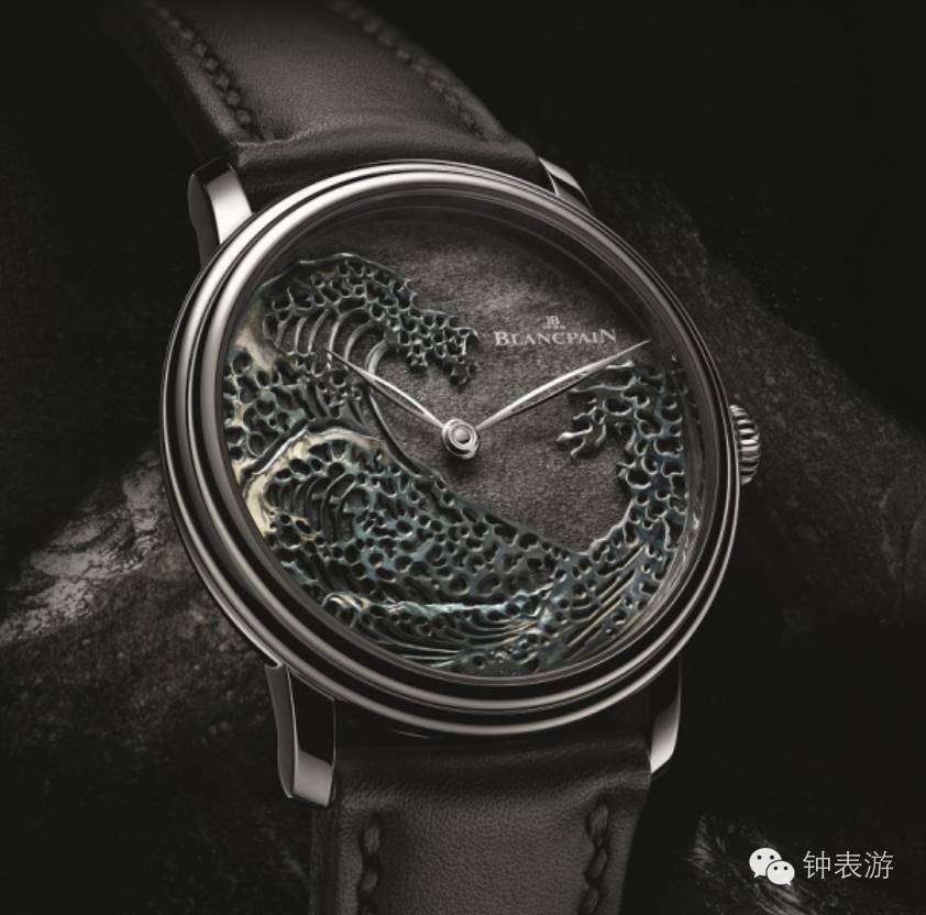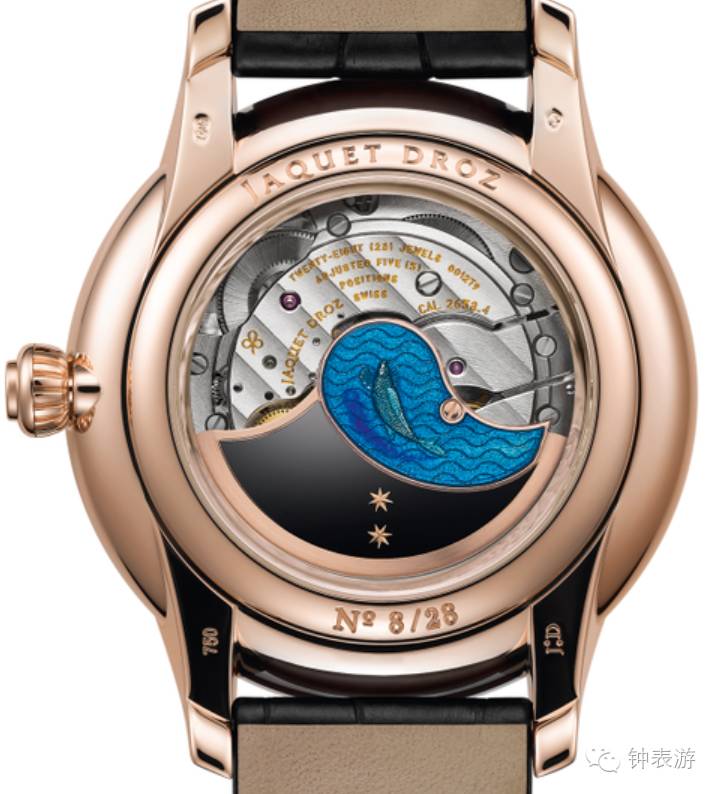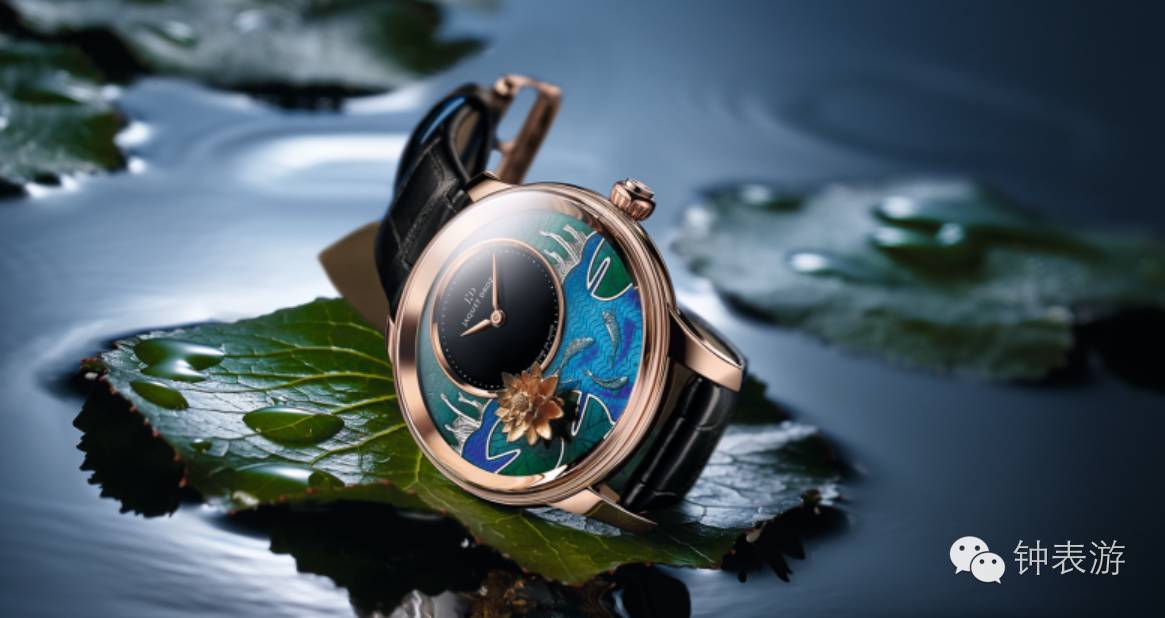 雅克德罗金雕锦鲤时分小针盘腕表,采用自动上链机芯,摆陀经过了精美的修饰和打磨