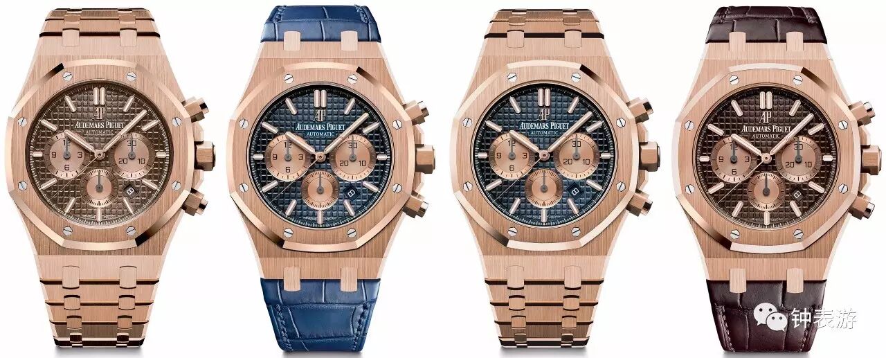 全新爱彼皇家橡树计时码表四款玫瑰金款式采用18K玫瑰金链带或鳄鱼皮表带,搭配蓝色或棕色“Grande Tapisserie”大格纹装饰表盘