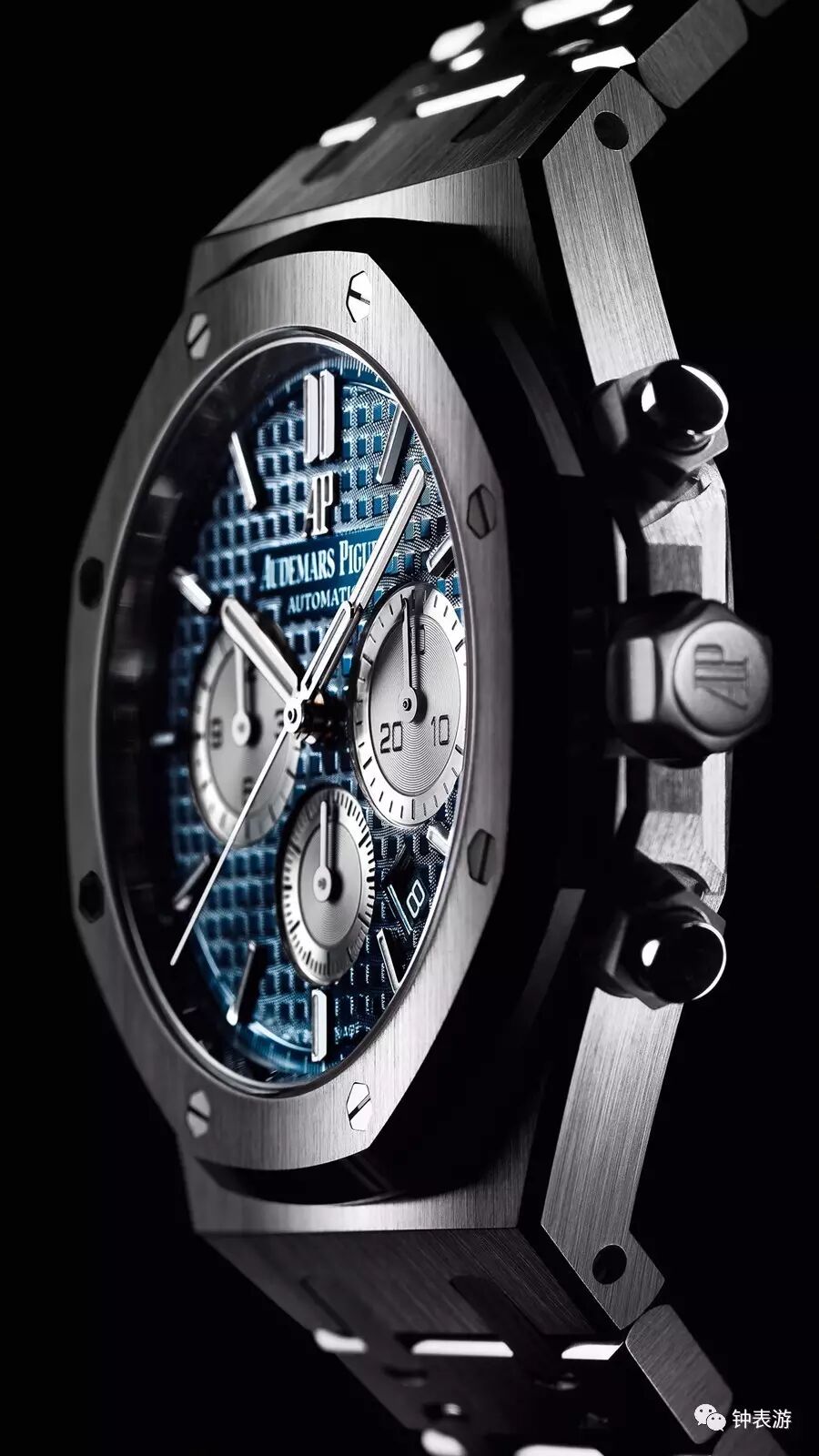 爱彼2017新款皇家橡树精钢表壳钢带款计时码表(蓝色“Grande Tapisserie”大格纹装饰表盘搭配银色副表盘),表壳直径41毫米