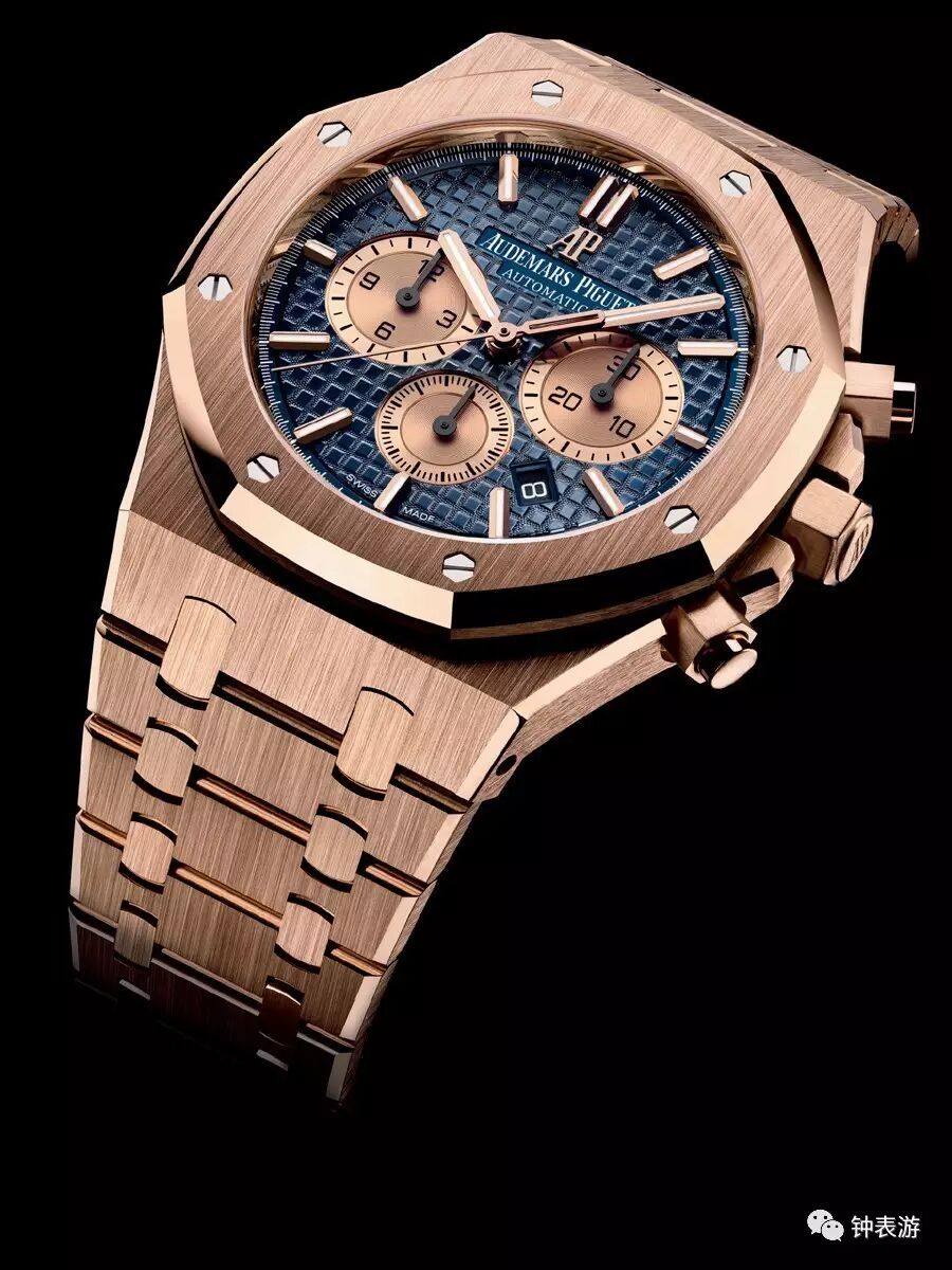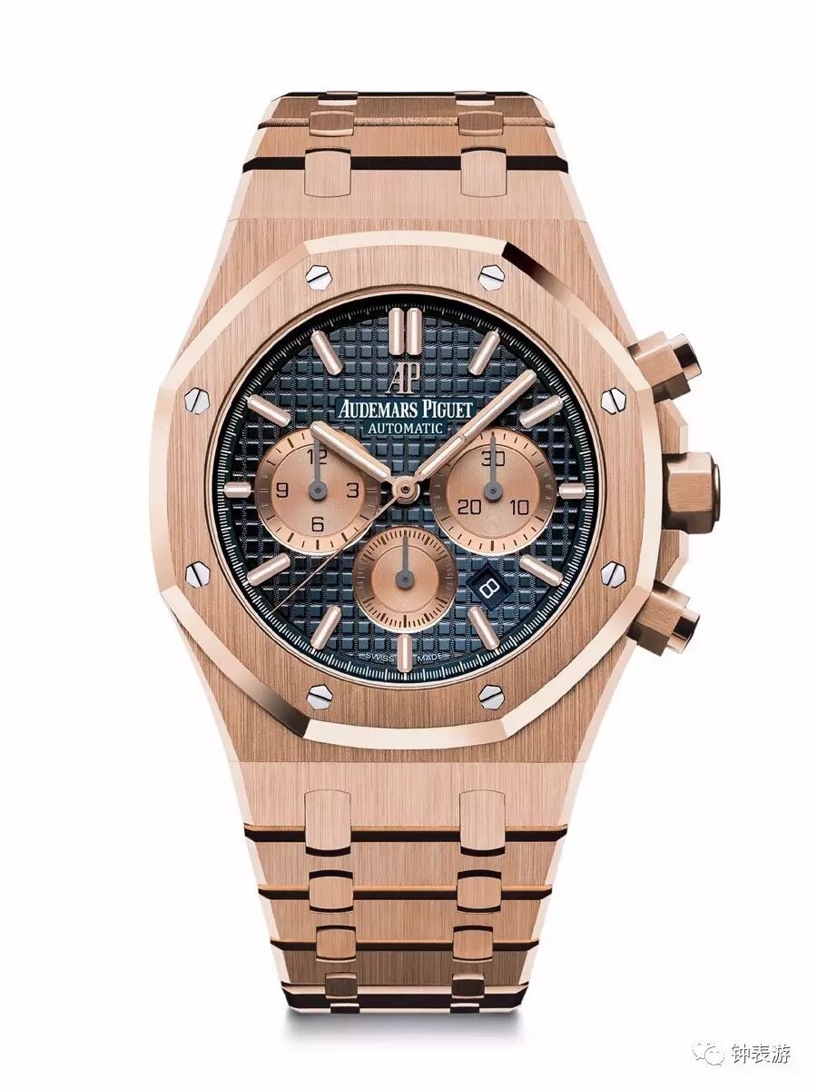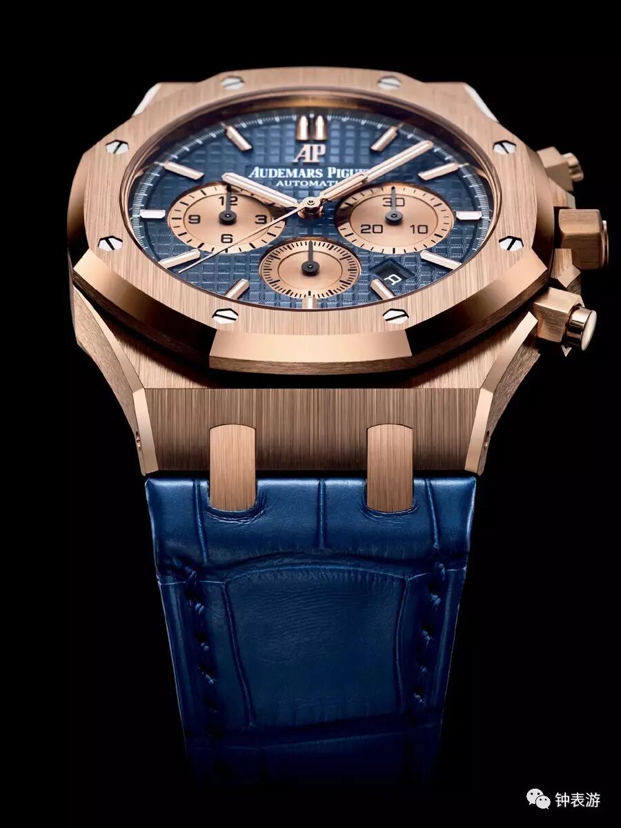 爱彼2017新款皇家橡树18k玫瑰金表壳皮带款计时码表(蓝色“Grande Tapisserie”大格纹装饰表盘搭配玫瑰金色副表盘),表壳直径41毫米