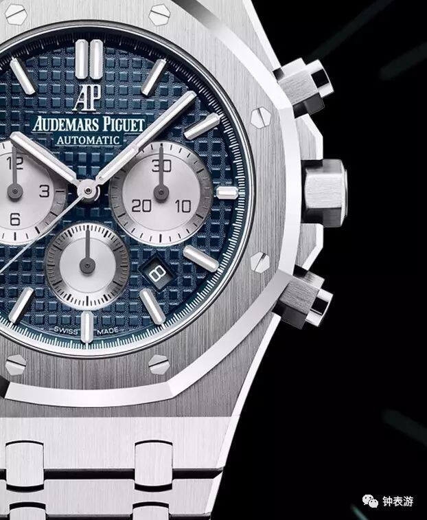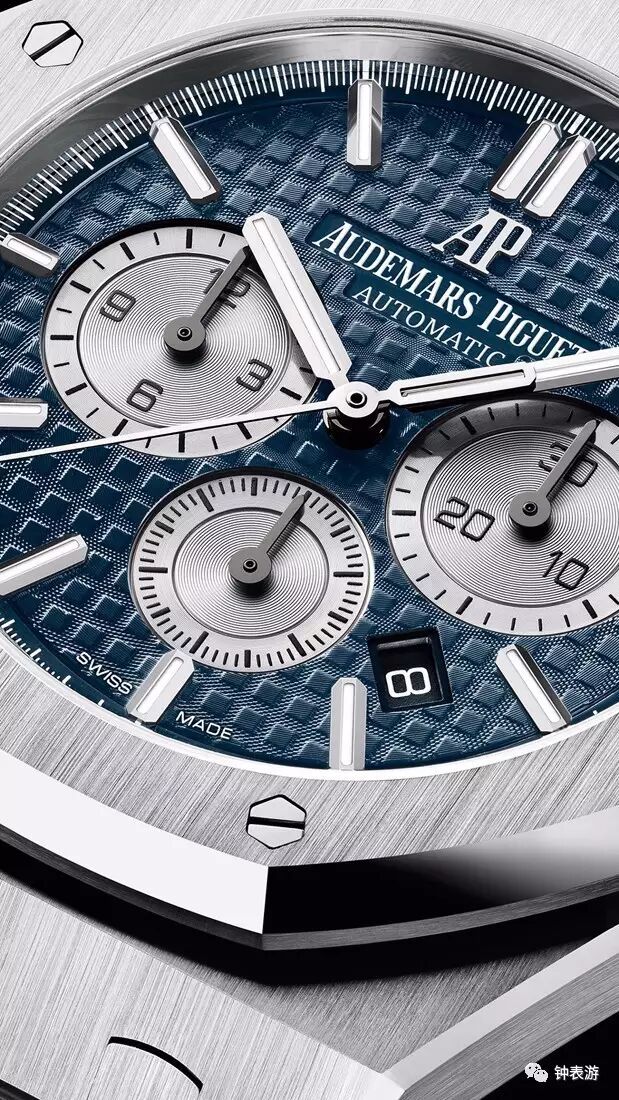 爱彼2017新款皇家橡树精钢表壳计时码表(蓝色“Grande Tapisserie”大格纹装饰表盘搭配银色副表盘),表壳直径41毫米