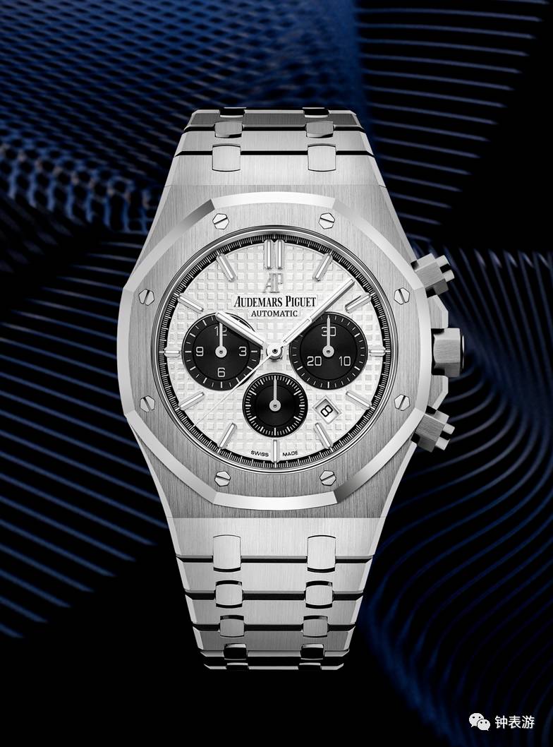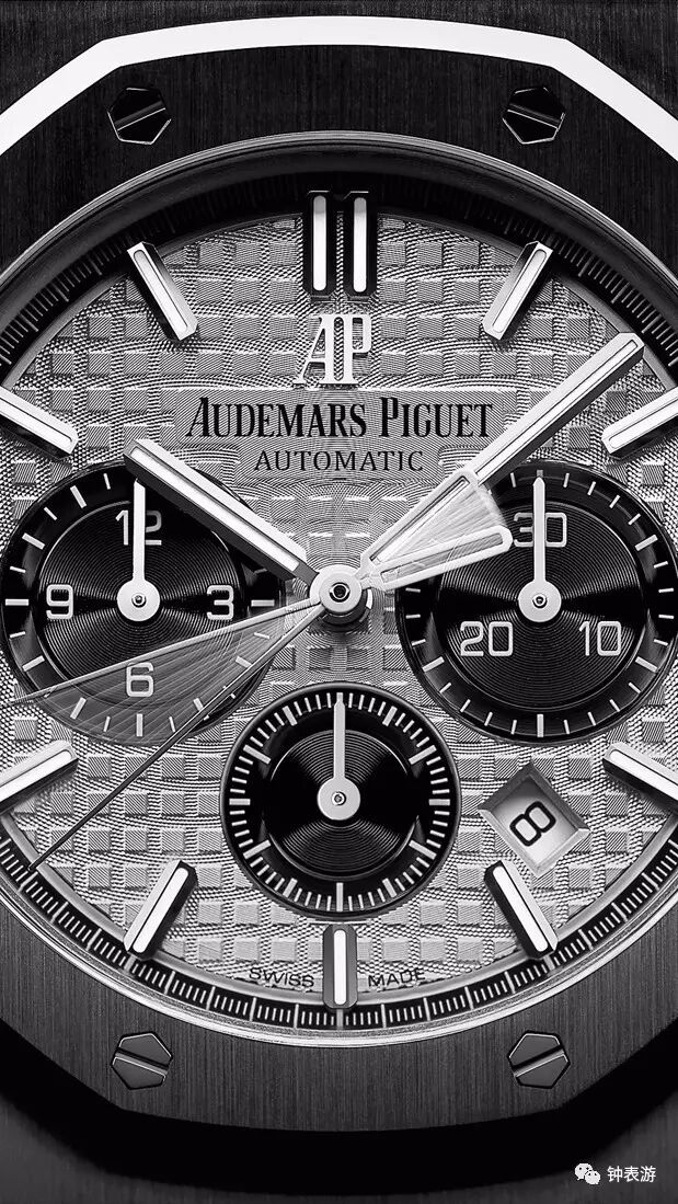 爱彼2017新款皇家橡树精钢表壳钢带款计时码表(银色“Grande Tapisserie”大格纹装饰表盘搭配黑色副表盘),表壳直径41毫米