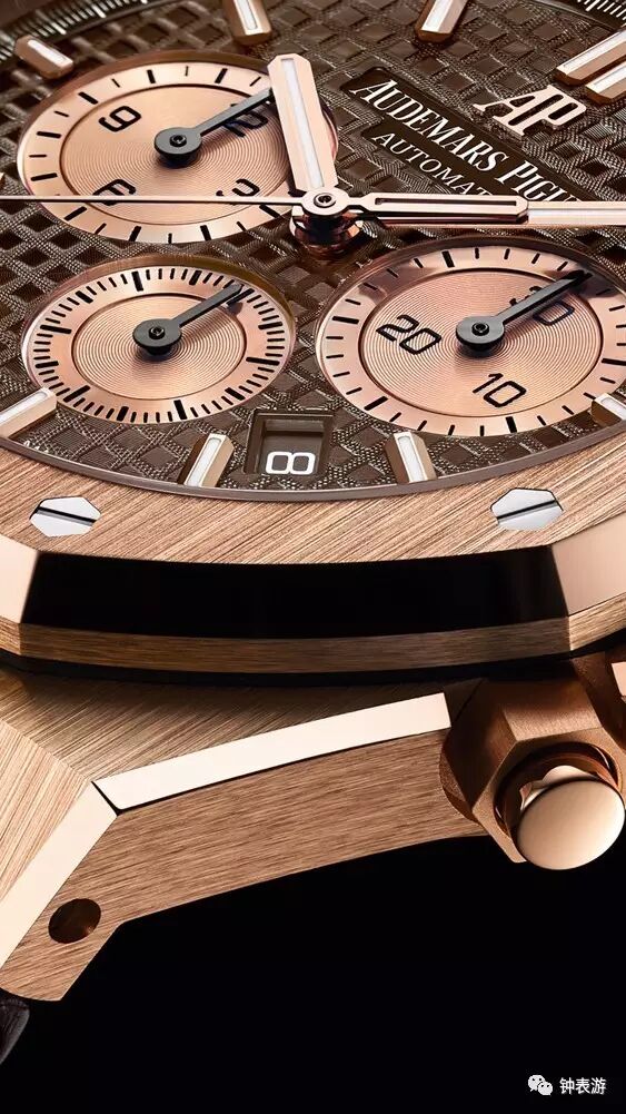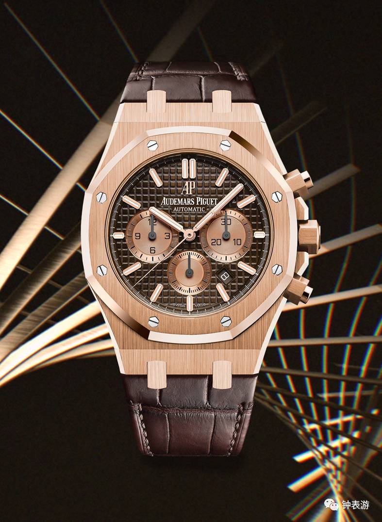 爱彼2017新款皇家橡树18k玫瑰金表壳皮带款计时码表(棕色“Grande Tapisserie”大格纹装饰表盘搭配玫瑰金色副表盘),表壳直径41毫米