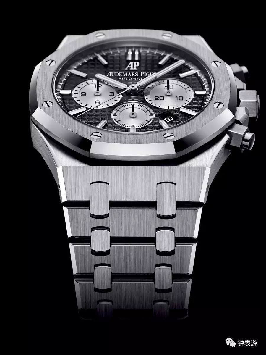 爱彼2017新款皇家橡树精钢表壳钢带款计时码表(黑色“Grande Tapisserie”大格纹装饰表盘搭配银色副表盘),表壳直径41毫米