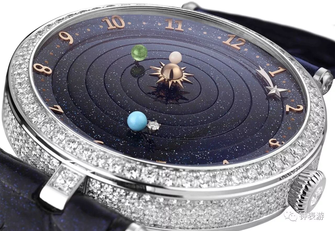 这款表精心选择象征着女性柔美的金星和月球为表盘主角,结合精湛的制作工艺,将立体而生动的设计融入到精巧的女装腕表之中。Lady Arpels Planétarium腕表表壳直径为38毫米,表圈和表壳侧面均镶嵌钻石,搭载为配合腕表尺寸重新设计的微小机芯,同时配备了与Christiaan van der Klaauw合作研发的专用模块。由镀铑金打造的璀璨流星为浩瀚苍穹画龙点睛,以优雅诗意的方式精准报时。表背设有两个显示年、月及日期的窗口,再以精致迷人的设计装饰四周。