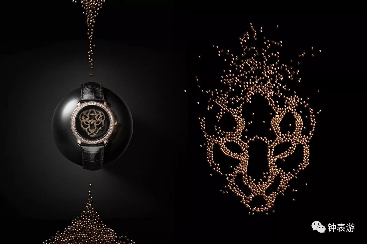 卡地亚玩味时光,如沙漏般往复流转。轻轻转动手腕,表盘上的细小金质圆珠便沿着经过缜密设计的轨道滚动,逐渐勾勒出精致图案。迷人的豹头浮现,于表盘绽放金色光芒,尽显鲜明而独特的风格,令人过目不忘。此款表有三个表款,分别以黑色、绿色或红色表盘,搭配18K玫瑰金表壳,表圈镶嵌钻石,表冠则分别镶嵌钻石、祖母绿及红宝石。