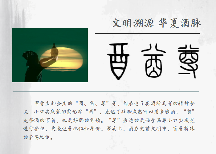 1982年7月,国家文物局组织晋中考古队,在山西杏花村考古发掘,出土了我国最早的酿酒陶器——小口尖底瓮,距今已经有6000多年的历史。这次发掘揭开了中国“酒”字的起源。甲骨文和钟鼎文中的“酒”字,就是从这种小口尖底瓮象形演化而来的。另外,这次考古还出土了酿酒用的蒸熟粮食的甑、鬲等,盛酒的壶、樽、罐,以浸泡酒料的泥质大口瓮,也出现了温酒的器具。山西杏花村因此被考古界称为“国酒之源”。