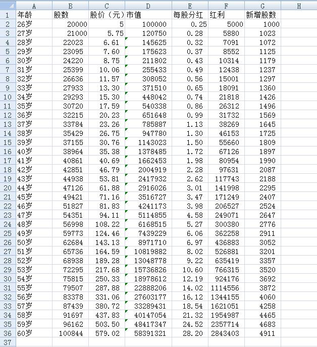 假设25岁,你有10万元,买入一只5元的股票,然后这只股每年盈利增长15%,分红也增加15%,股价也上涨15%,到退休60岁你会拥有多少财富。