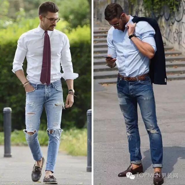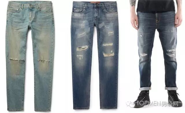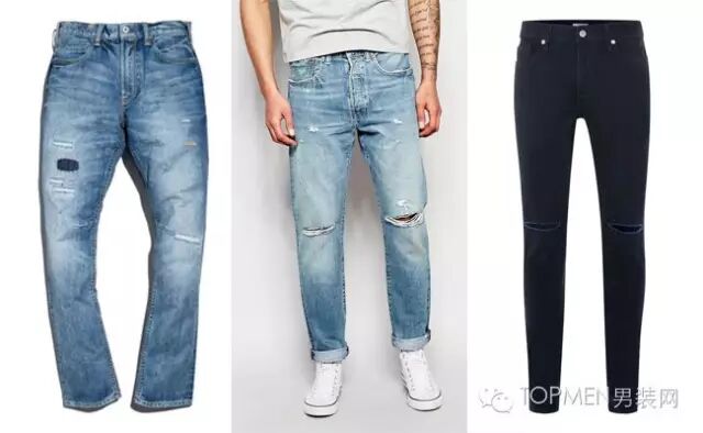 轻熟男们千万不要觉得破洞是小朋友玩的不适合自己,时尚不分年龄。不过你们不需要那么夸张的破洞,一个在膝盖处的破洞就刚刚好,会更吸引妹子哦。休闲一点可以搭配亨利领素tee或者POLO衫。