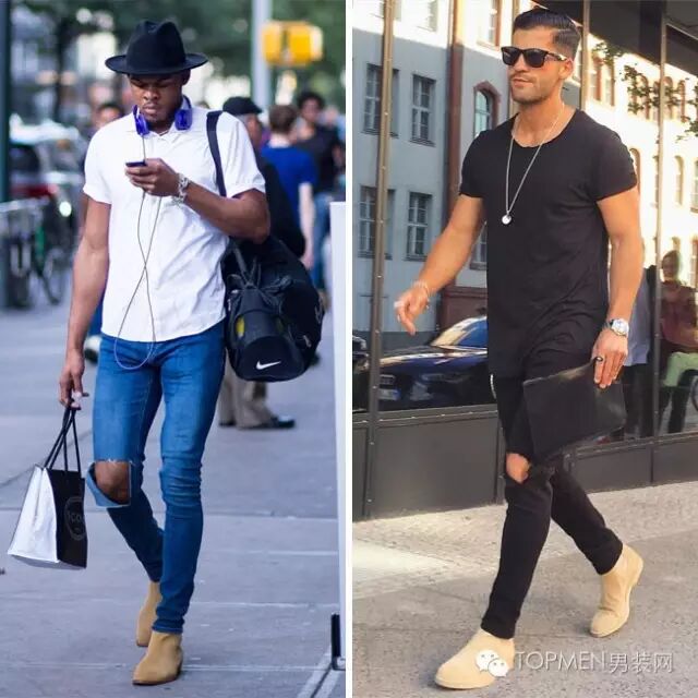 想要时髦一点也可以选择修身破洞牛仔 黑/白T恤 切尔西靴,这可是这一两年的最夯搭配。