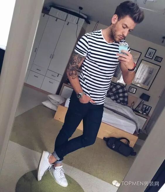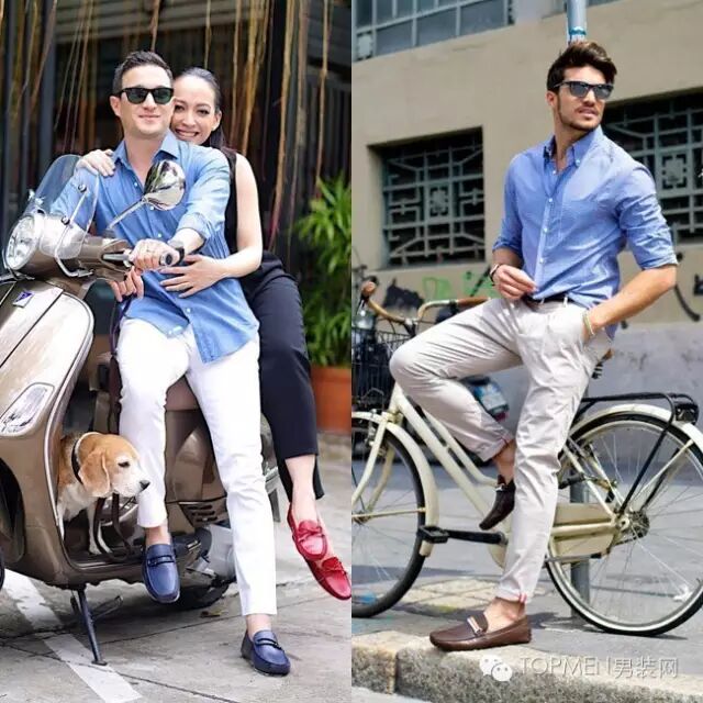 个人还是觉得豆豆鞋适合商务男士多一些,比起T恤更适合搭配看上去更有质感的衬衫。夏日不妨试试蓝色衬衫搭配九分休闲裤就很有熟男魅力。