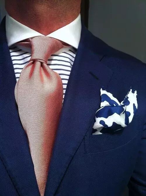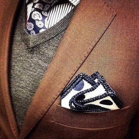 其实很多人会将口袋巾塞的很里面,偶尔就露出那么一丁点。其实不然,只要不是太过分的大范围将口袋巾露出的话,最主要的还是要好好展示出口袋巾亮眼之处。往往一身穿搭给人一种亮点聚焦在口袋巾而不是服装上,这才是它的成功之处,也是佩戴它的原因。