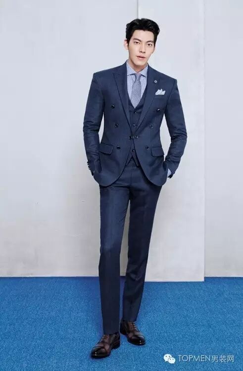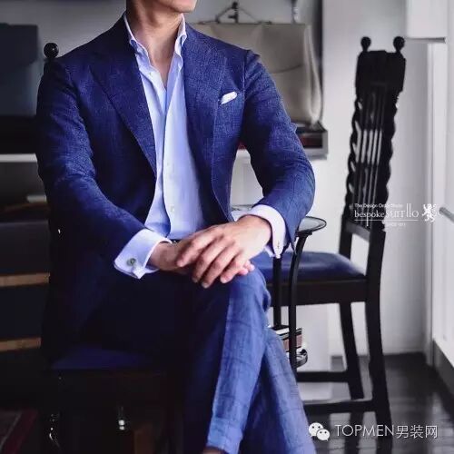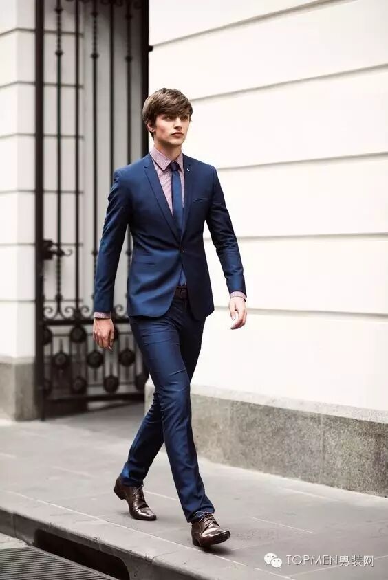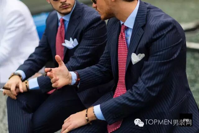 不建议搭配蓝色的西装,但如果是花色的话就另当别论。比如下面条纹西装给人感觉就比较浮,但是海军蓝就有让它沉下来的能力,搭配起来恰到好处,可以适当加入酒红色配饰。