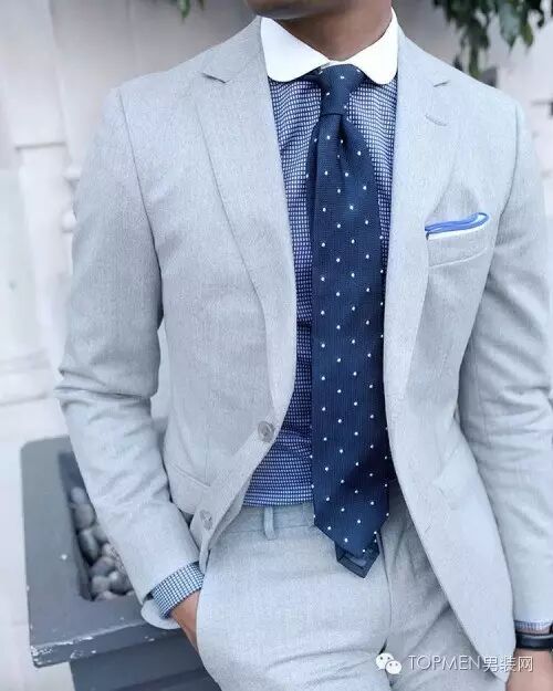 浅蓝色衬衫和灰色调西装的搭配整体风格更商务一些,所以是上班族的不错选择哦,下身可以搭配海军蓝的裤子,起到一个色调呼应的作用。