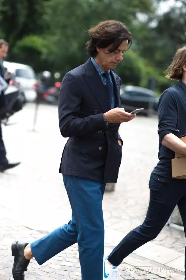 即使是和色调比较相近的海军蓝西装放一起,本应该会显老气的组合居然很神奇地将无聊的商务风格抹去了一大半。