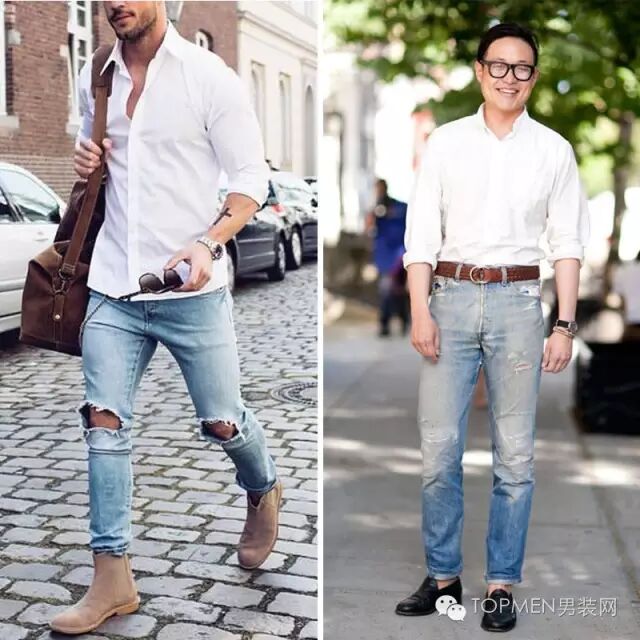 要是比较日常的装扮,牛仔裤当然更青春咯,搭配破洞和麂皮切尔西靴适合喜欢街头风的男神,直筒的款式搭配乐福鞋则能更大限度地保留大叔的雅痞范儿。