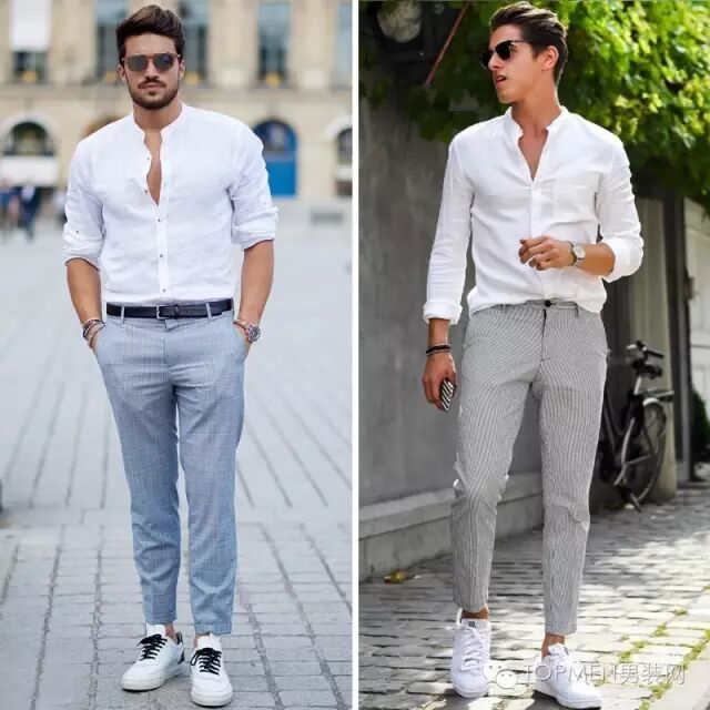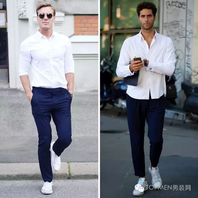 上面海军蓝的裤子比较沉稳,换作灰色系的西装裤整体色调都会被提亮,看起来也会更精神,搭配一双小白鞋即使去上班也要时髦到底。