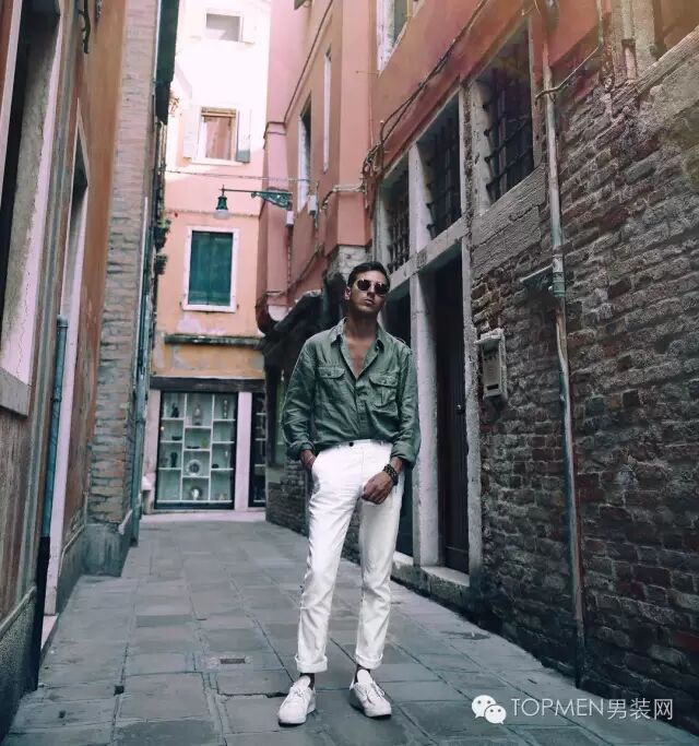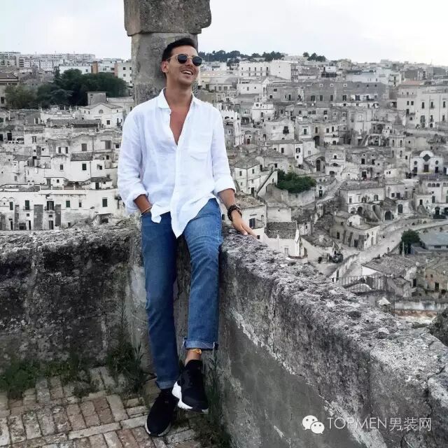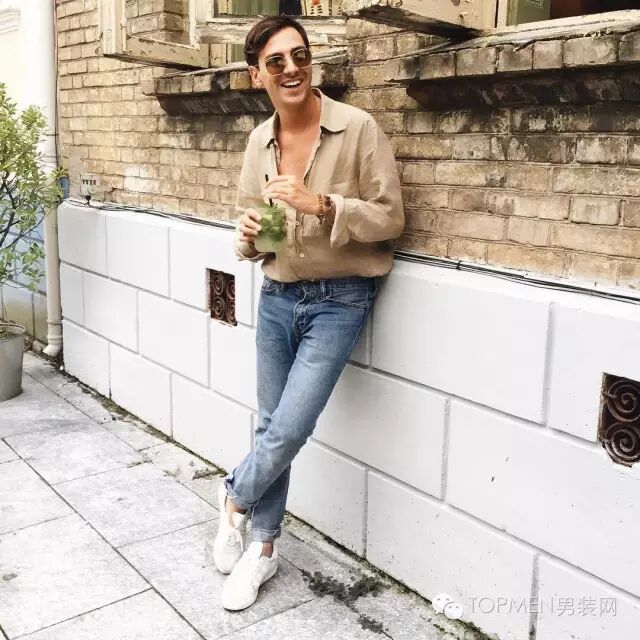 最后来说说偏文艺范儿的棉麻衬衫。它总能给人一种清风拂来的feel,所以色彩上一般是比较沉静的色调,大都是米白色系或者蓝色调为主。时尚博主Roberto De Rosa就很喜欢用宽松的棉麻衬衫搭配牛仔裤,既不失男人味,又能保有活力和时尚度。