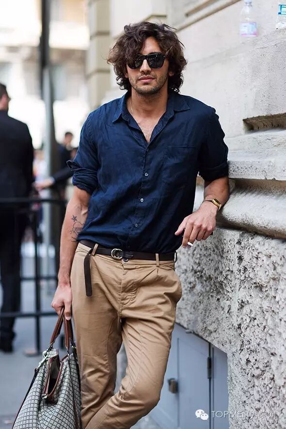 海军蓝色调的棉麻衬衫风格上更稳重,所以有点沧桑感的大叔穿起来会更有味道,也比较适合穿去上班。