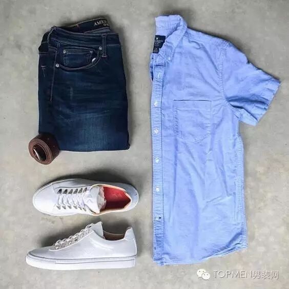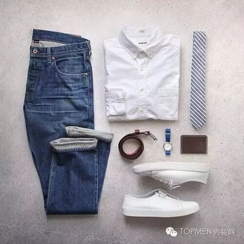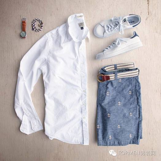白衬衫因为颜色的关系,多少有些透色,所以最好是内搭白色的Tee,适合阳光少年。