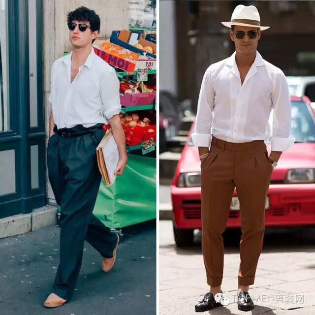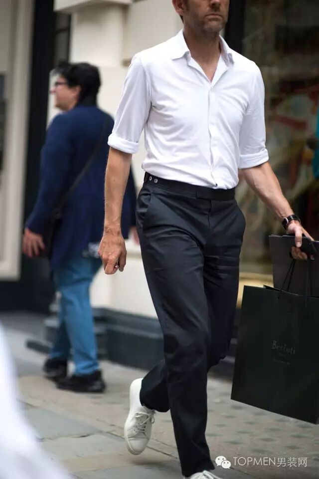 时装周的街拍潮人最近都还蛮喜欢下面这种复古绅士风的,用偏宽松的白衬衫搭一条锥形裤打造一种慵懒感,但是这种造型还蛮挑人的,你要是有自信也可以自己穿来试试看。