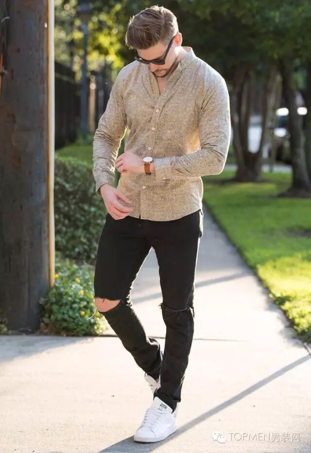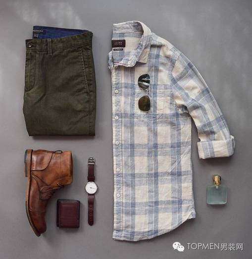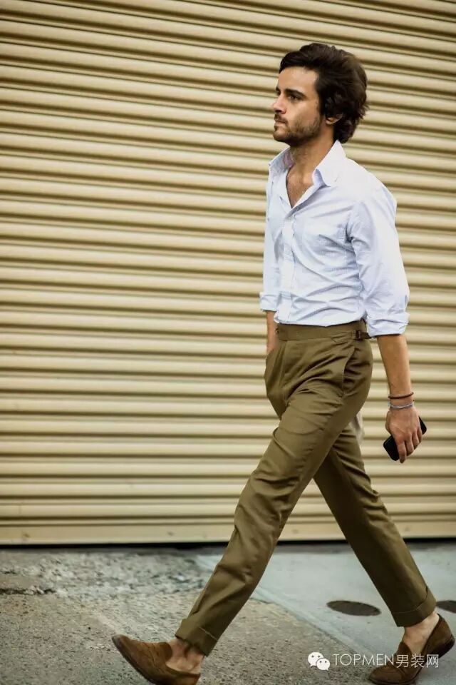 如果你真喜欢上面的风格却又不敢尝试,其实是变通一下的,把裤子换成九分直筒卡其裤,再来一顶草帽或者搭配乐福鞋,整体造型会收敛一些,但效果是差不多的。