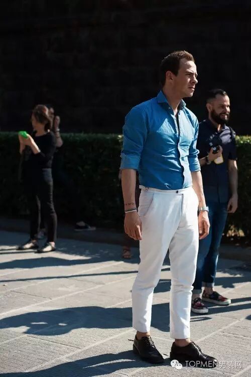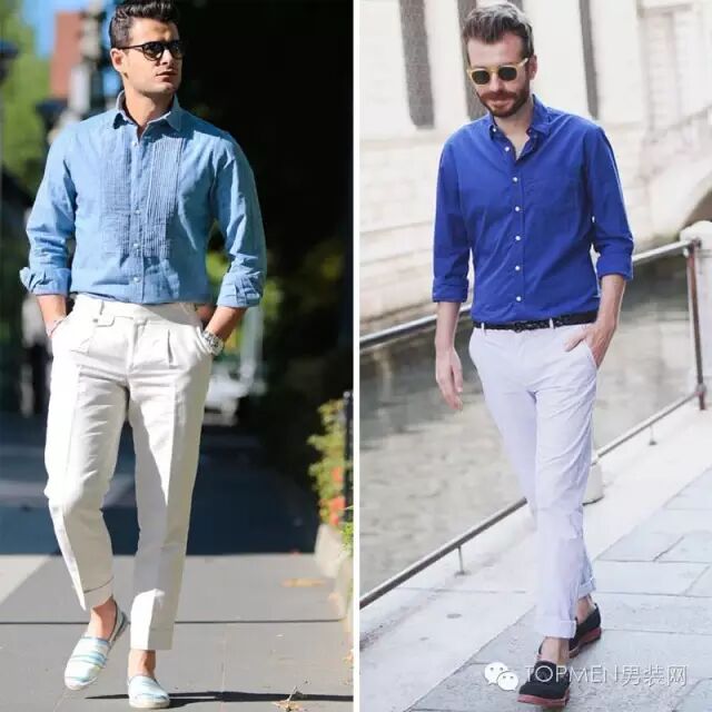 特别是在搭配白色裤子的时候,蓝衬衫的魅力就越发浓烈了,有种把人带到爱琴海边的既视感。