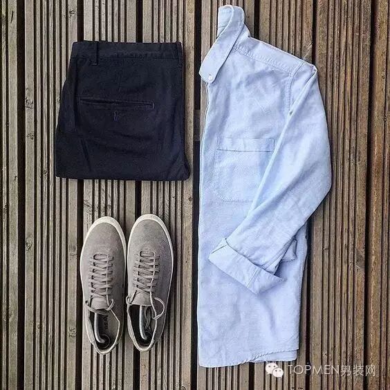 蓝白这种亮眼的配色走在街上让人不多看你几眼都不行,但若是你想要低调,蓝衬衫同样拿手,只是在选择的时候就要以棉麻质地且饱和度比较低的款入手,再搭配海军蓝的裤子,想不低调都难。