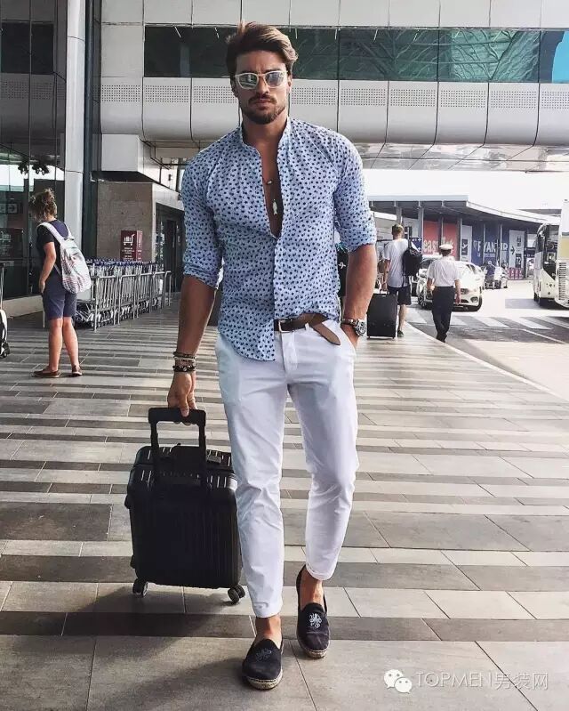如果你真的是去海边城市度假,而且又刚好喜欢绅士风,那么蓝衬衫 米白色调的高腰九分裤 乐福鞋绝对能让你坐拥迷妹,要是还嫌不够骚,可以再戴顶草帽和打个领巾。