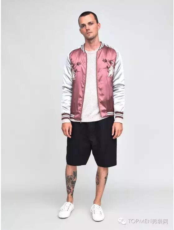 虽然有很多的新元素加入,但是横须贺夹克有一个特点是不变的,就是色彩亮眼。这也和面料本身的特性有关,不过在配色上通常也会选择一个比较艳丽的颜色,比如蓝色、红色或是绿色,所以在搭配上最好用简单的黑白去平衡整体的视觉效果。