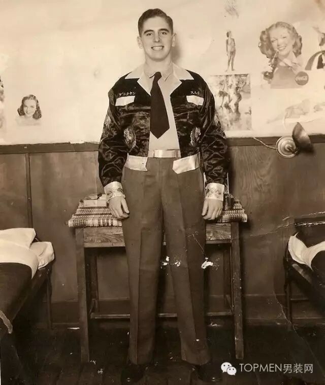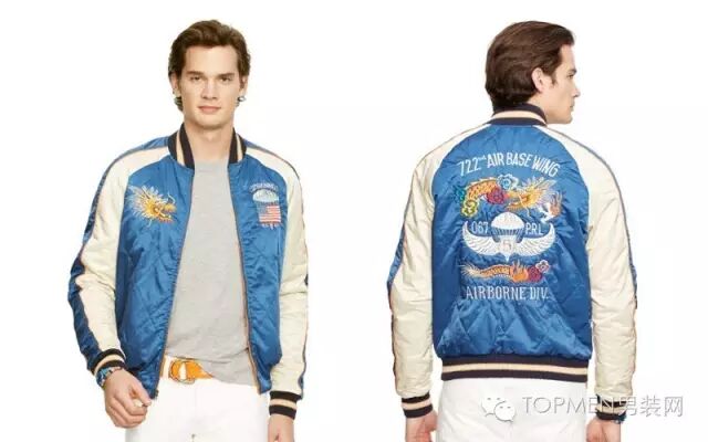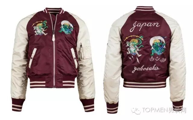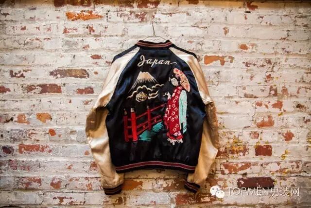 为什么我们看到的横须贺夹克上会有很多日本元素,甚至有的直接就秀上“Japan”?这就要把时间倒回二战时期,驻扎在日本横须贺市的美军在回国的时候想要带些手信回去,而当地又盛产丝绸,所以当地人就结合美式文化把丝绸做成了类似飞行员夹克的样式。