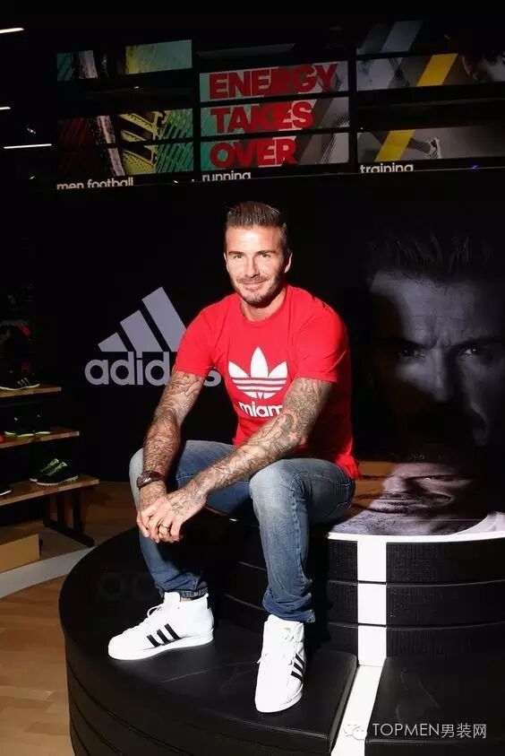 如今的字母tee主要就是两种风格,要么就是言简意赅,直接在素Tee上印上自己品牌的logo。比如下面小贝穿的三叶草Tee,搭配牛仔裤和小白鞋,年轻20岁有木有。