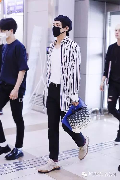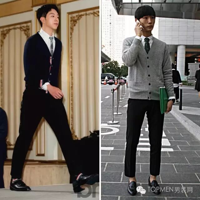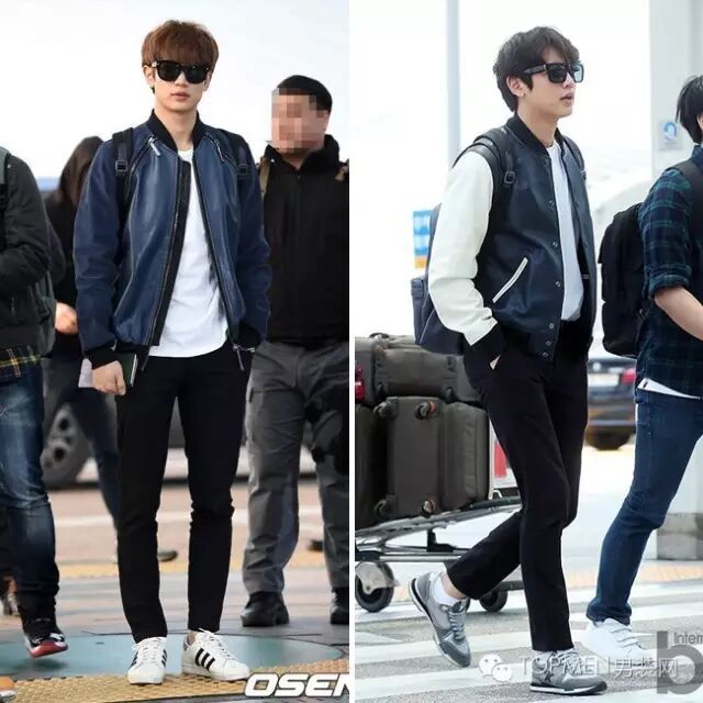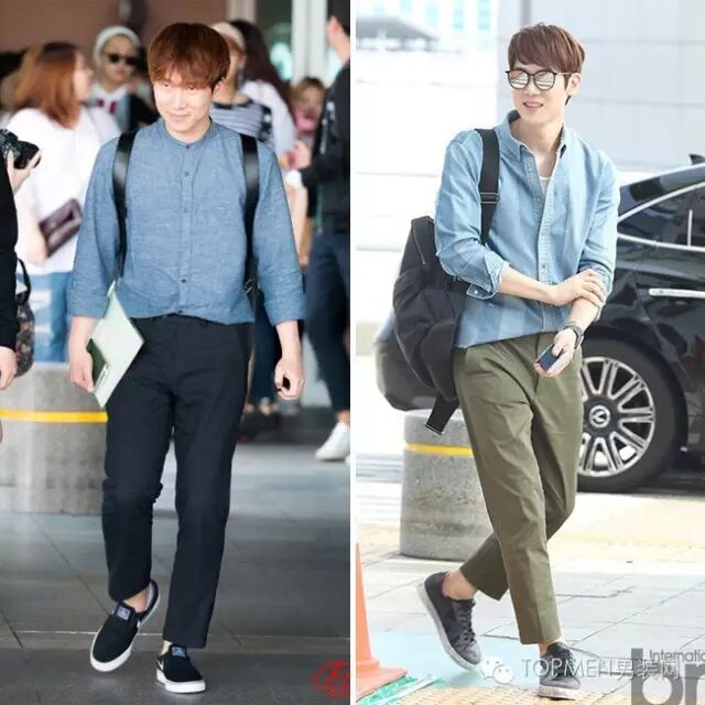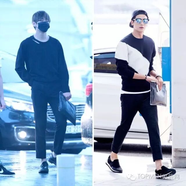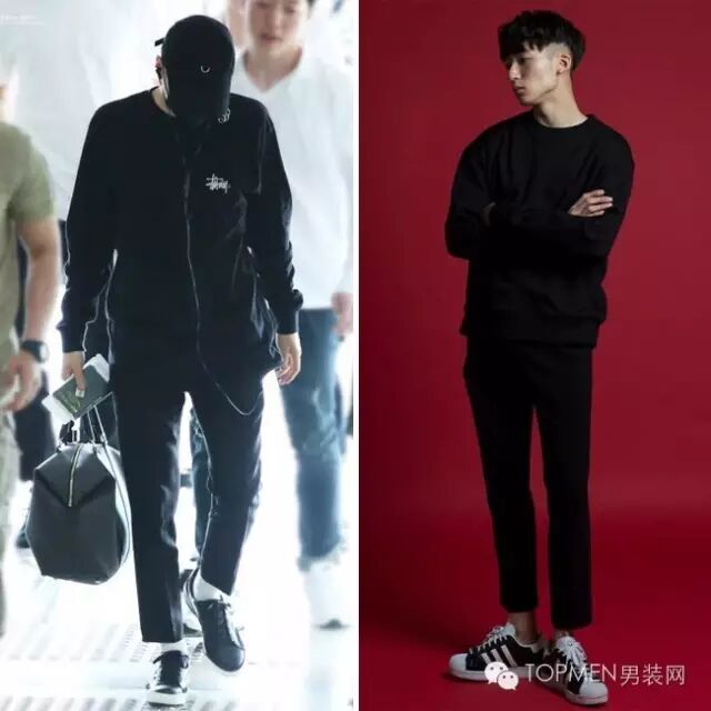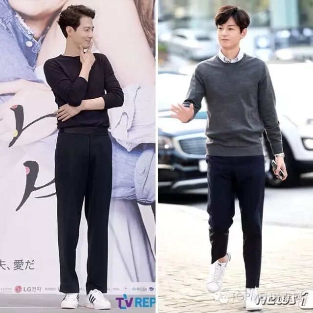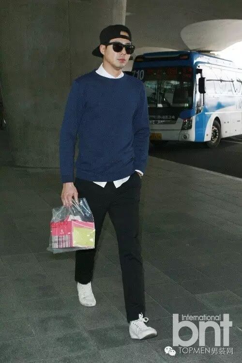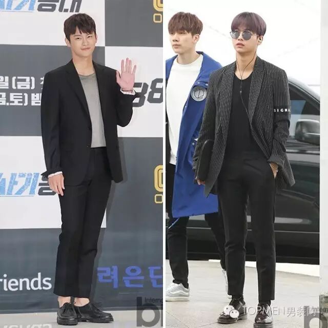 这时候你如果再拿个手拿包,其实风格会更偏轻熟暖男一些。由于多是深色搭配,所以也可以像右边欧巴那样内搭一件稍长的T恤增加层次感。