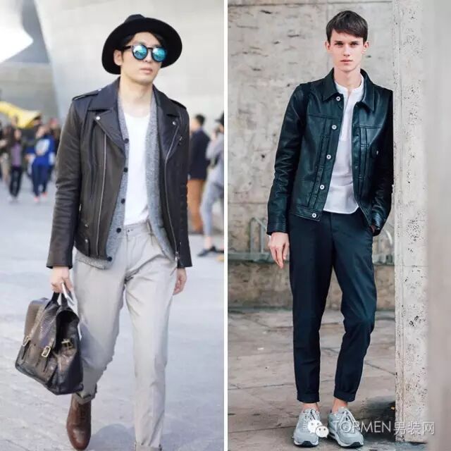 除了bomber jacket之外,皮衣也是秋季一大男神必备。搭配米色系单品 皮鞋展现成熟潮男范儿,换成深色裤装