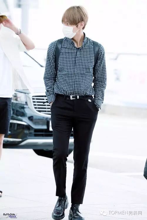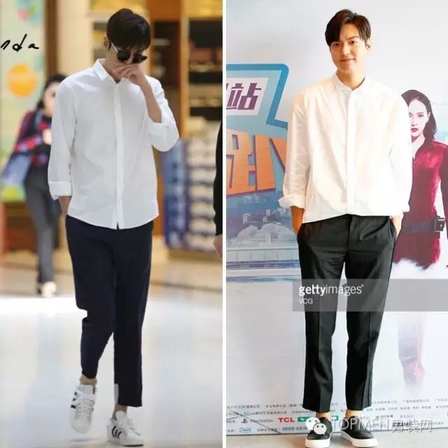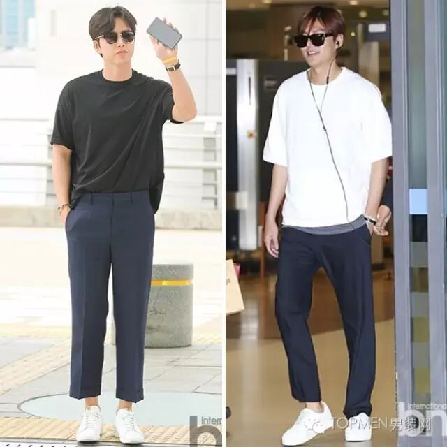 素色短袖常常会给人比较休闲随性的感觉,但是如果把它和西装裤放一块儿,那么整个人看起来立马就能精神很多,而且男人的稳重感也出来了。韩国欧巴最近都比较偏爱五分袖的H型T恤,再搭配宽松的九分西装裤和百搭小白鞋,既有暖男气质还有点儿阳光学长的feel。
