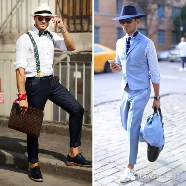 当然啦,你要说你就喜欢西装裤的绅士范儿,那也可以继续绅士风走起,不过常规的正装穿搭难免无聊,其实也可以有很多变化的。比如早秋你就可以加一个背带或者是搭背心。