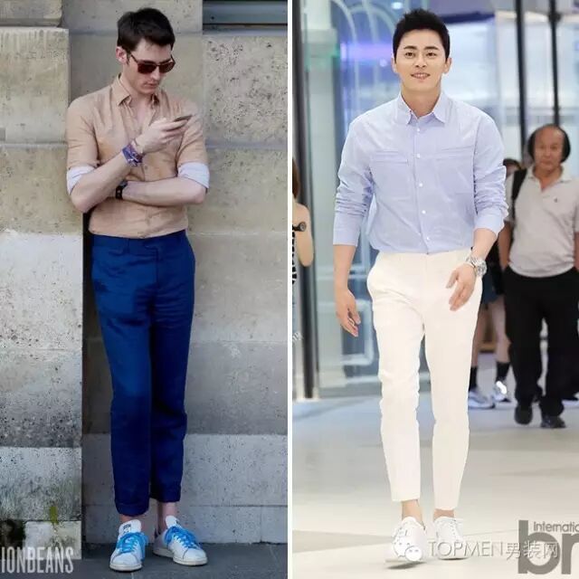 衬衫本身在正装里运用得就比较多,所以和西装裤单独搭配起来照样可以如鱼得水。但是不同的衬衫同样风格万千。比如你本身就是轻熟男,那么在衣柜里随便拿一件直筒版型的西装和九分西裤就能搭,但是为了避免过于商务,色彩上就不要老是黑白,鞋子也可以换成小白鞋。