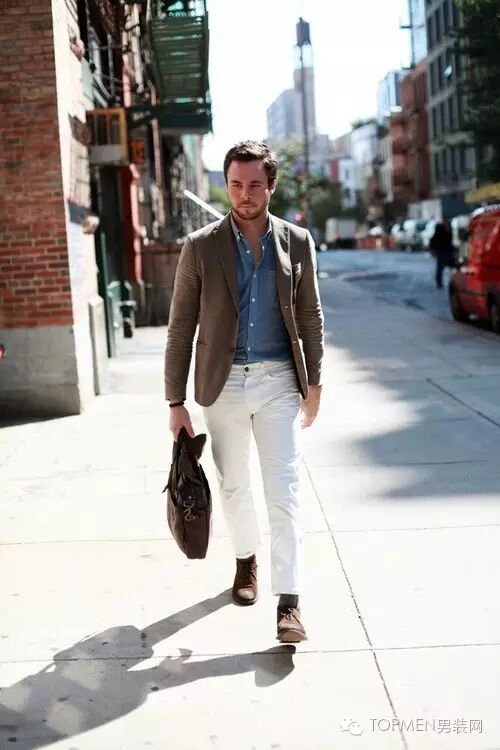 5.棕色西装 牛仔衬衫 米色斜纹裤 沙漠靴