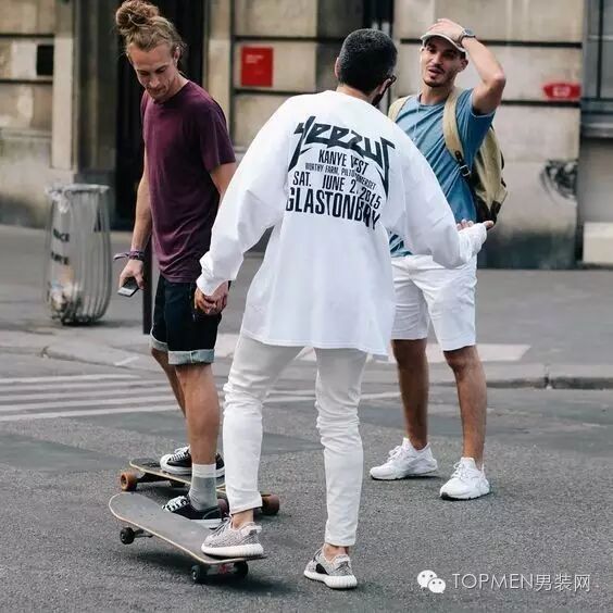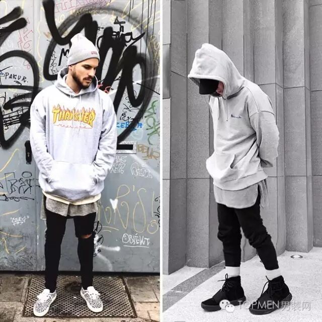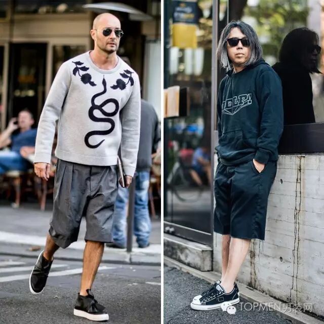 3.轻熟男中的潮男(黑灰做主色):稍微宽松的卫衣(肩部合身) 过膝短裤 板鞋