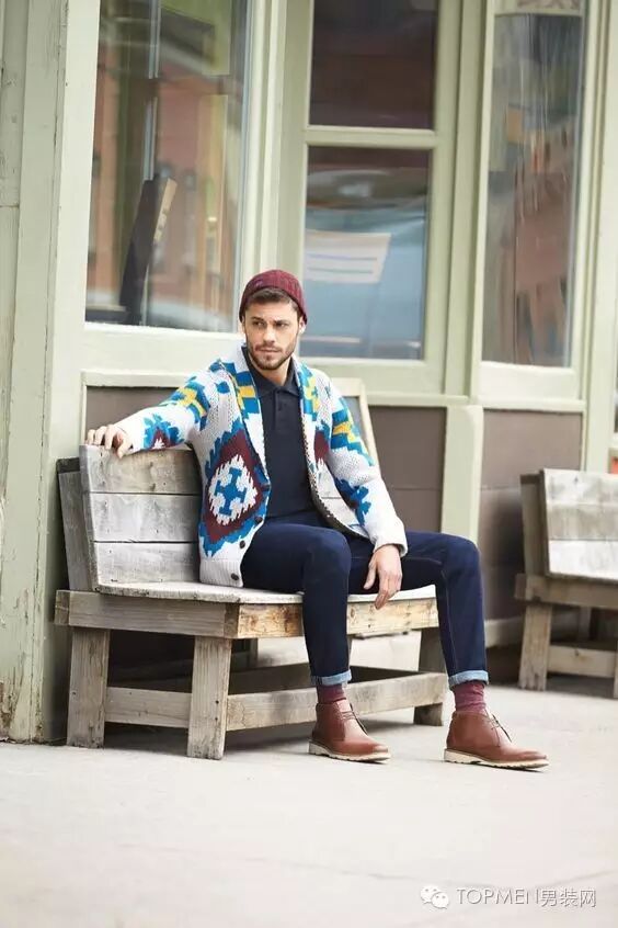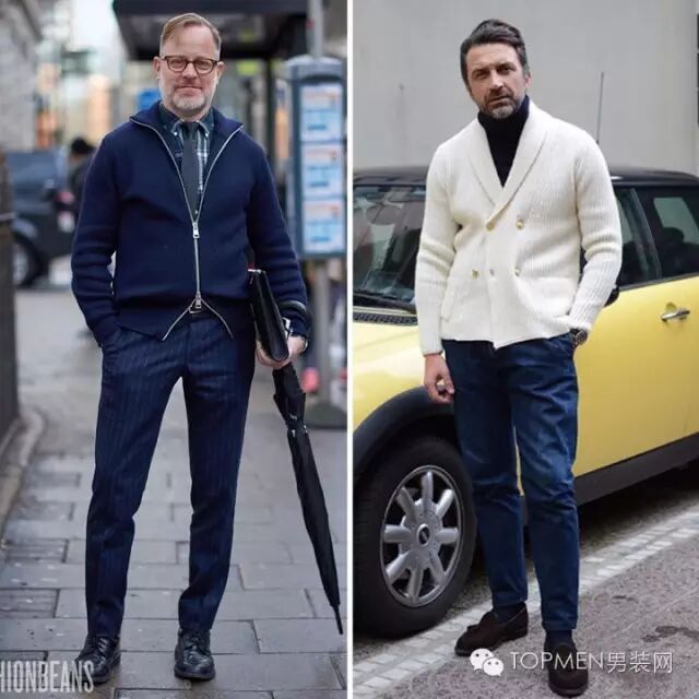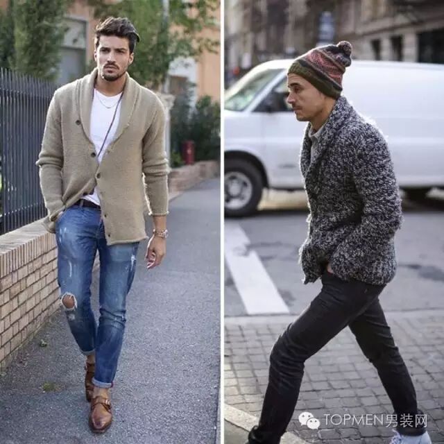 另外成熟一些的男士除了最经典的针织开衫之外,青果领粗针织的也蛮适合单穿的。