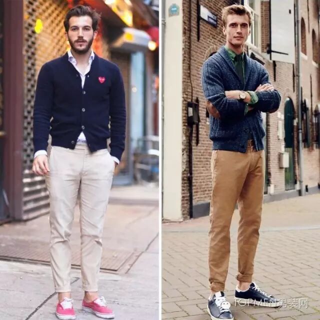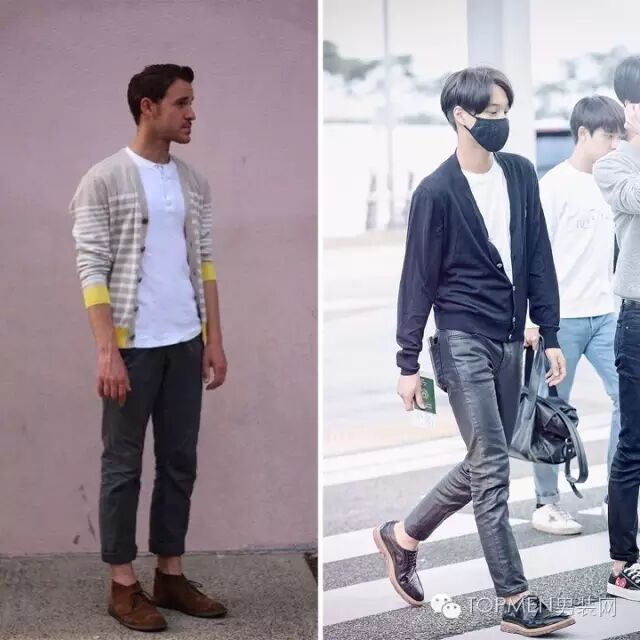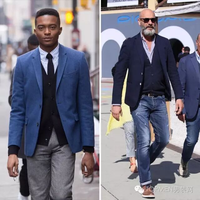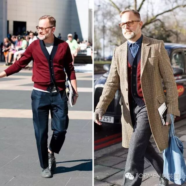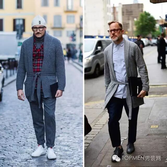 其实像那种合身的细针织开衫拿来内搭也是绰绰有余的,比如下面的时尚编辑Bruce Pask,同一件开衫两种穿法都不错,而且一点都不浪费。