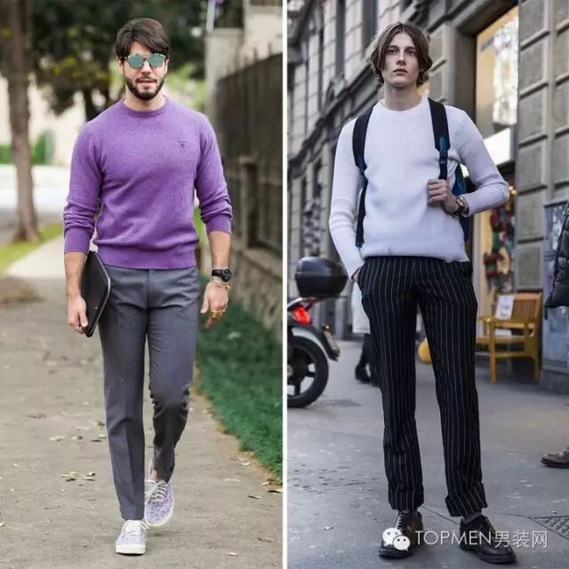 如果是商务型的男士你也可以搭配西裤来穿,下面一位是紫色的骚气,一位是白色的简约,都有能抓人眼球的能力。