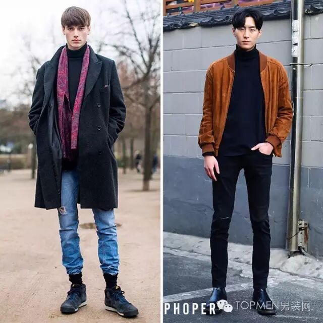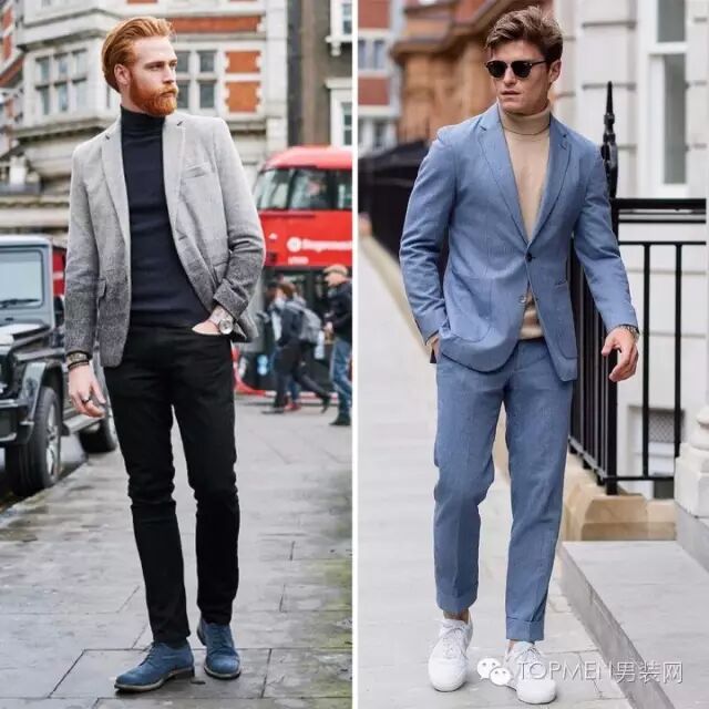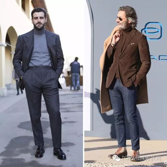 但如果是搭配西装粗针织就不合适了,还是细针织的高领衫更搭,想要更有特色,不妨尝试一下和外套同色系的高领衫,不过色彩当然还是经典的中性色更好,比如下面两位的灰色和棕色。